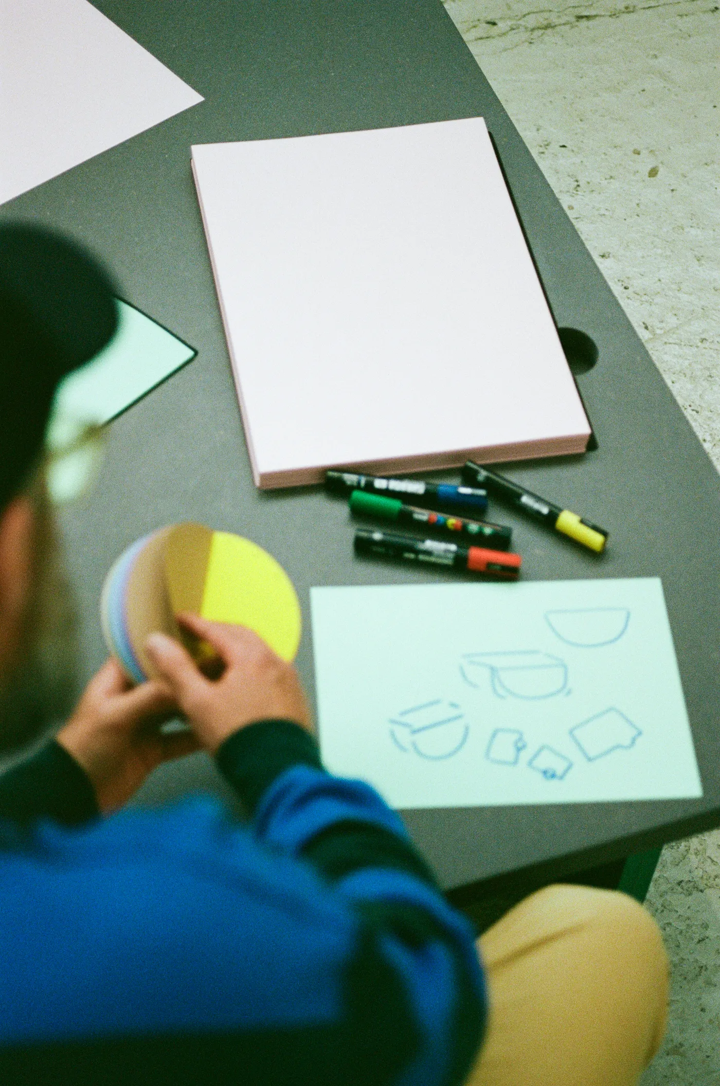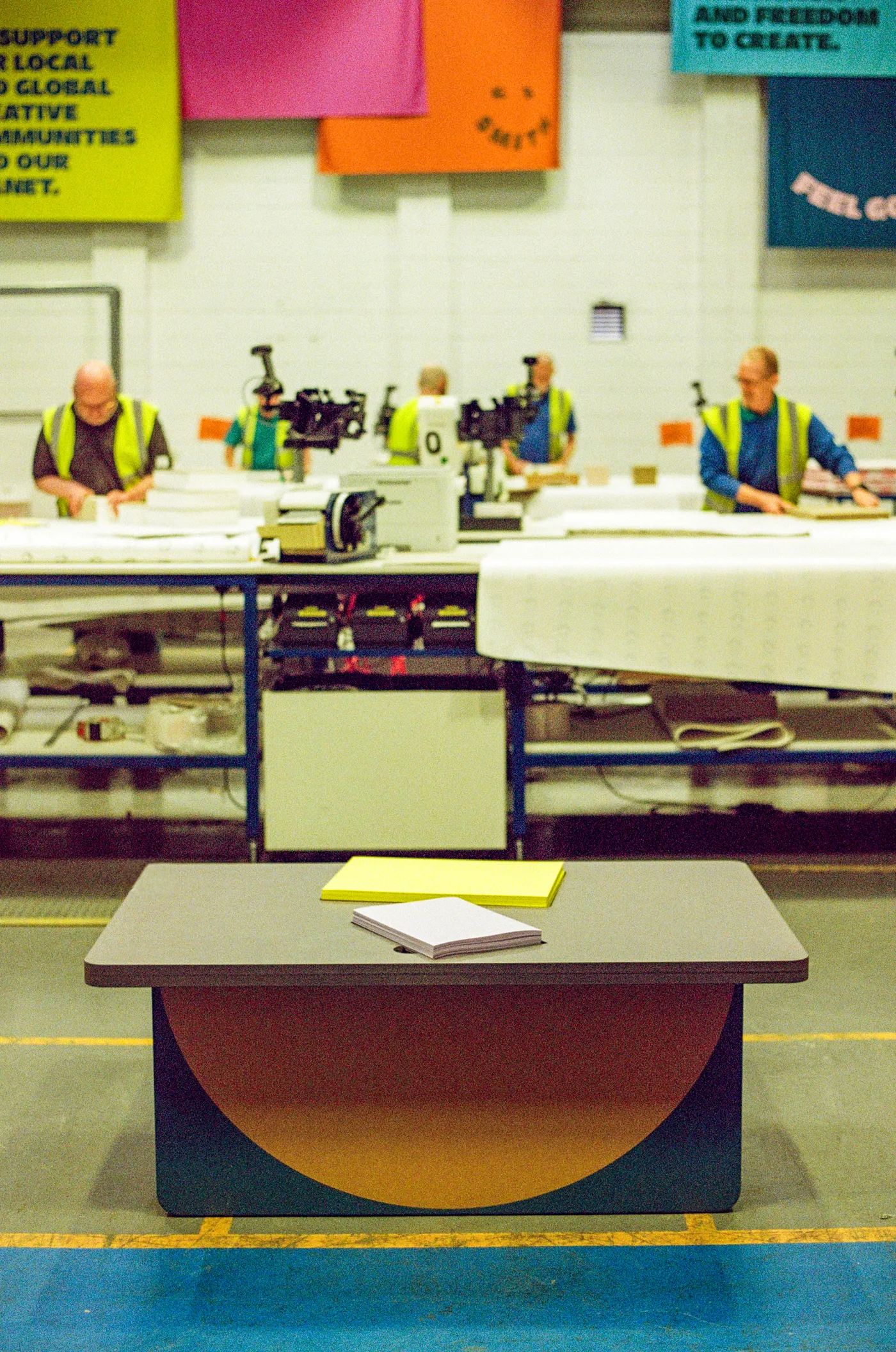 Once I saw the new rebrand by TEMPLO, it seemed to pull focus on the design process, and a big step was when we added the smile shape to the legs. This allowed us to simplify the top and make it more practical. Something clicked, and it became a more user-friendly table which still celebrated the Colorplan paper and the potential of play.